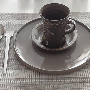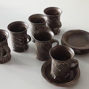 European Handcrafted Coffee Cups & Saucers set of (6) - mocha colored with Vanilla swirl accent - 4" H x 3" W - saucer is 5" W - very unique :)