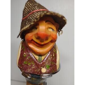 Bottle stopper is vintage and is wood carved and hand painted. His hat is a cloth fabric material Size is 4" tall with the cork. Has wear to the painted surface and the cork base. STAND NOT INCLUDED