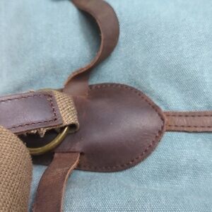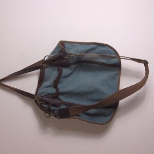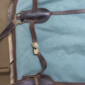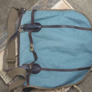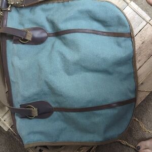 Another piece I had to saved from the landfill! The material is canvas and leather. There are no brand tags! But with research I found it is a European portfolio bag. the long shoulder strap with clasps can be removed. There are a few spots noted in the pictures and one metal button missing. The inside is clean, but the top zipper is missing pocket still functionable! In the last few pics I turned the inside outward so you can see how clean inside!