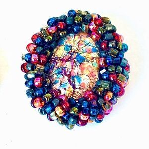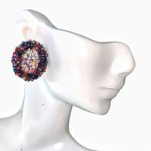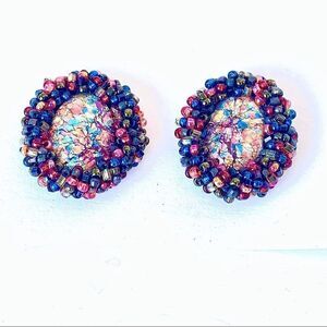 Beautiful multi color confetti glass cabs surrounded with hand beaded glass beads. Vintage stones and beads, the earrings were made by jewelry artist Lisa Jo Silberkleit of Sonoma. Truly fun snd beautiful, they measure approximately 1” x .75”. They are pierced with a suede back, they will come with the artist’s statement. Please see all photos for full description.