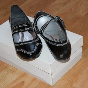 Comfort shoes for women in black leather with fashionable white stitch that pops on feet. It is a flat but has a cute velcro strap across so it is like mary jane. Great leather used, sturdy soles and absolute best walking shoes for women. Last 2 sizes left - manufactured in Europe, Poland out of quality leather. Wonderful shoes for ladies that will last years - quality and hand made model.