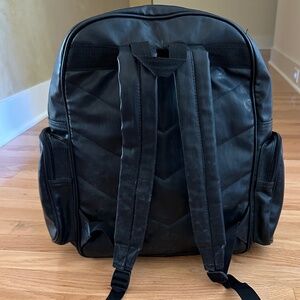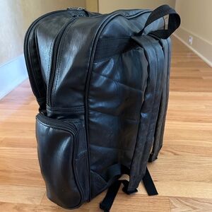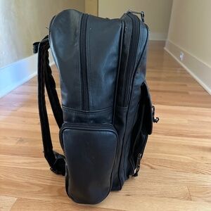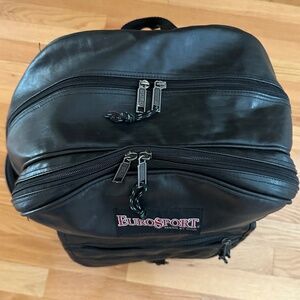 Eurosport Large Black Backpack by HYUK. The name Eurosport suits this backpack as it would be great for traveling across a country. It has two large, roomy interiors, two side zippered pockets (pic 12), and three compartments on the front. The two main compartments of the pack each have a dual zipper pull opening (pic 2.) The largest has a padded, quilted back with a tab at the top to hang small items for quick access (pic 10.) The front flap has a zipper compartment on the fold-over flap (pic 1.) The flap secures with a sturdy brass tone clip. Lift flap to find a slip pocket that secures with velcro and a zippered pocket on the front of it (pics 7-8.) Adjustable shoulder straps. The tail of one of the straps is frayed (last pic.) No material info tag. I cannot tell if it is genuine leather or faux leather. If faux, it is an excellent imitation. Excellent condition.