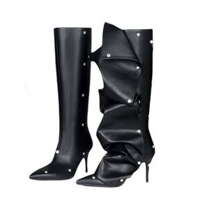 Women's Knee High Boots, Pointed Toe Stiletto Shark Boots, Detachable High Heels, Long Folding Boots, Long Ruched Boots with Studs