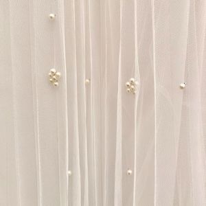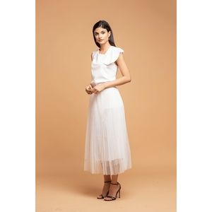 A white, midi tulle skirt with knee-length liner. The tulle is pleated and sprinkled with white pearls. Elastic waist. Also available in black.