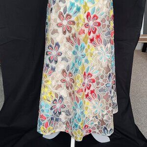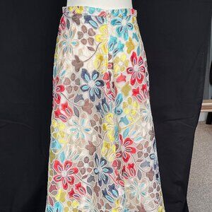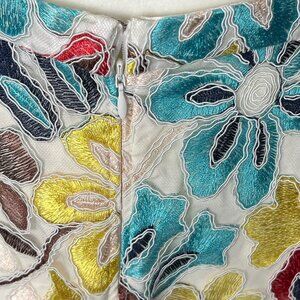 Eva Franco Embroidered Skirt. NWT. Sold by Anthropologie. Size 6. Multi-colored embroidery including cream, blue, yellow, red, light brown and other colors. Fully lined. Back Zipper. Length (approximate) 32 inches. Hand wash.