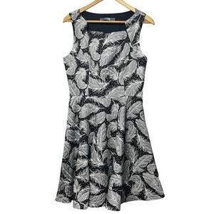 Eva Franco Fit & Flare Dress Black White Jacquard Feather Print Sleeveless Sz 10