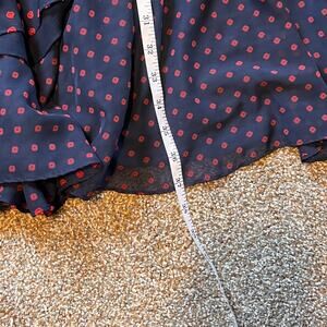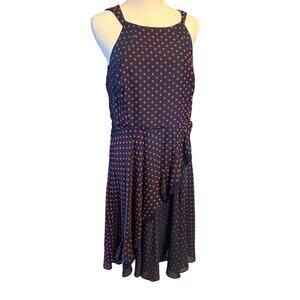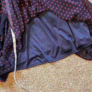 Chic navy midi dress with red polka dots. Sleeveless design. Flowy skirt with ruffle detail.