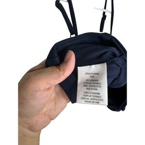 Chic navy blue Eva Franco side zip crop top. Features gold buttons and adjustable straps.