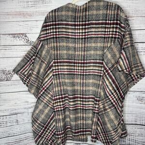 Cozy and stylish Eva Franco wool-blend kimono jacket in a beautiful neutral plaid pattern with touches of burgundy, tan, and black. Features open front design, relaxed fit, and soft woven texture—perfect layering piece for fall and winter.
