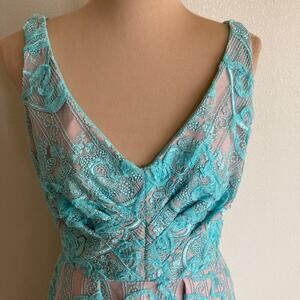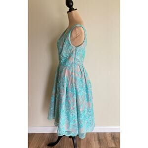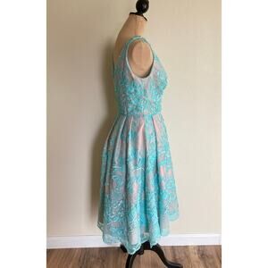 Eva By Eva Franco V-Neck Dress 8 Teal Pastel Turquoise Blue Floral Lace Overlay Midi A-Line Fit and Flare Retro Nude Lining Tulle Underskirt