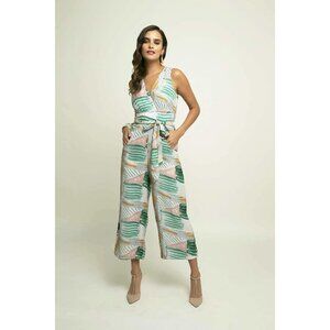 The Gable Jumpsuit has a wrap, V-neck front, side pockets and a back zip. The cropped style is fully lined and comes in our light and airy Rum Baba abstract print that blends shades of green, gold, pink and gray.