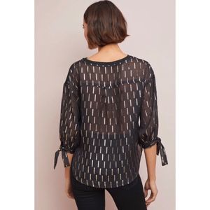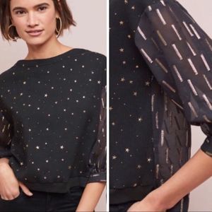 Delightful as it is whimsical and fun, this Eva Franco for Anthropologie Black Matilda Top features charming gold foil stars on the front and a sheer black back with a broken gold stripe pattern. Eye catching and unique, with 3/4 sleeves and darling bow tie detail. NWT, Size Medium.