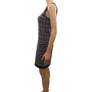Chic and versatile Eva Mendes Collection for New York & Company dress. Sleeveless shift silhouette in a sweater-knit tweed texture with subtle metallic threading for just the right amount of sparkle. Black, white, and red woven pattern with contrast trim and two front pockets. Perfect for work, cocktails, or holiday gatherings.