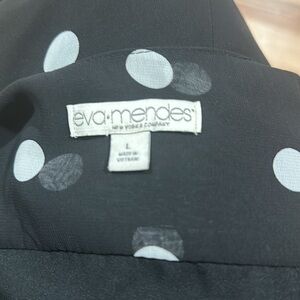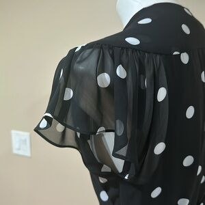 Chic and timeless, this black maxi dress from the Eva Mendes Collection features a classic white polka dot pattern and an elegant wrap design. The lightweight flutter sleeves, flattering V-neckline, and tie waist create a feminine silhouette perfect for any occasion—whether it’s work, a date, or an evening out.