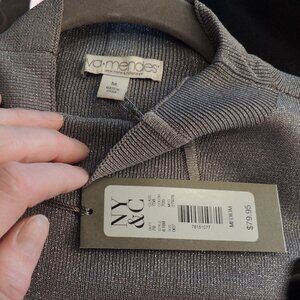 Stunning Eva Mendes Collection for New York & Company metallic shimmer midi dress in a gorgeous gray/silver tone. Features a sophisticated mock neckline, long sleeves with elegant tie cuffs, and a flattering tailored silhouette with front darting for shape. The subtle metallic threading gives the dress a beautiful sparkle—perfect for holiday events, evening wear, or special occasions.