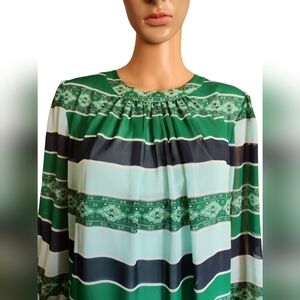This dress is pretty and modern with a comfortable, flowing cut. It's easy to wear and fun to be seen in! The material is sheer but it is lined fully, except the sleeves. No stains or holes, great shape.