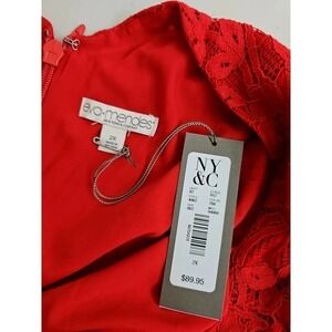 Elevate your style game with this stunning red dress from Eva Mendes New York & Co. Perfect for any occasion, this knee-length sheath dress boasts a boat neckline and short sleeves with an elegant lace fabric that adds a touch of sophistication. The dress features a zipper closure and is fully lined for comfort.