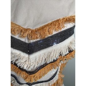 How fun is this beauty! An old vintage flapper vibe with the fringe and sequins. The bottom is lined also. A little spot on inside of bottom edge lining which isn’t noticeable when worn. Also a little bit of the fringe was worn on the tush side probably from being sat on. Pics included to show this..