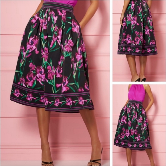 Elevate your wardrobe with this chic A-line skirt, showcasing a stunning pink floral pattern on a sleek black base. Ideal for any stylish outing.