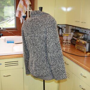 This is a jacket by Eva Tralala. It is marked as being 45% wool (in French) and has a Persian wool look and feel. It is a light to medium weight jacket. Yes there are shoulder pads. It has no size tags that I see but it is about is about 25 inches long and 20 inches pit to pit. It is in nice shape.