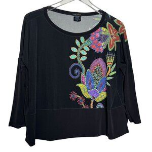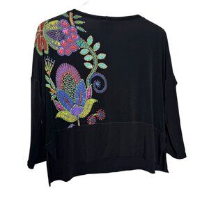 Eva Varro slinky jersey top black size small dolman sleeves bright print shirt