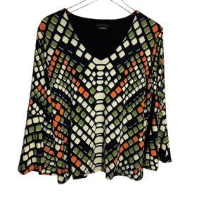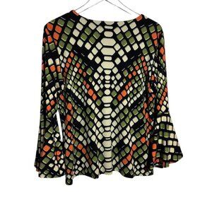 Eva Varro womens size Large top Slinky jersey knit black print bell sleeves