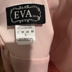 Eval halter bridesmaid dress, preowned, built in bra pads. Only stains are at the bottom of dress. Picture included but they should be available to be washed off.