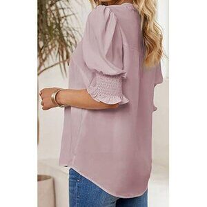 Evaless Summer Casual V Neck Tunic Blouse Ruffle Short Sleeve Pink Size XXL