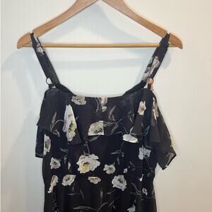 New With Tags Evans Floral Ruffle Sleeve Dress. Ruffle sleeve and chest, Adjustable straps, Midi length. Ruffle/ flutter hem with slight high-lo affect. Side zipper.