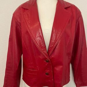 Vintage 90s Red Leather Jacket Shoulder Pads, pockets and fully lined. Great Condition Evan Davies Brand