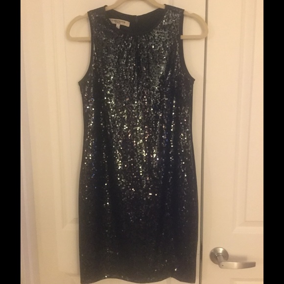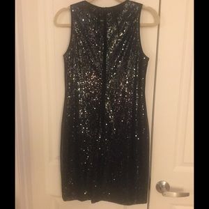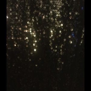Fun, shapely and forgiving party dress. Size 6. Back zip. Outer shell is 95% poly, 5% spandex; lining is 100% poly. What's fun about this dress is a sheer black layer covering the sequins without losing the sparkle. It makes a sequin dress much more comfortable. Worn once. Zero wear or tear.