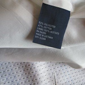 Shell 53% polyester, Lining 100% acetate. Dry clean