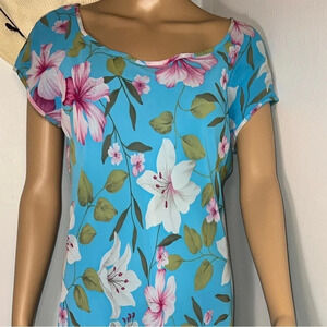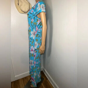 Evan Picone, 8,slip on, short sleeve, boat neck, large floral print maxi,w/flutter hem.
