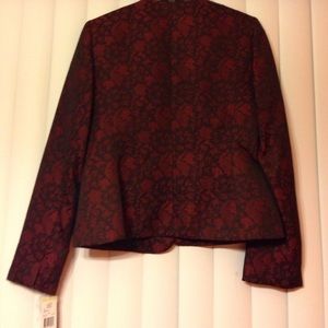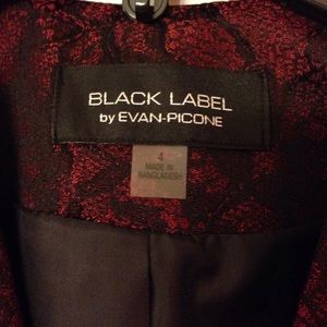 Black Label brocade suit jacket. Red and black size 4 100% polyester. New with tags. Length 22" shoulder 17" sleeve 24". Worn 1 time