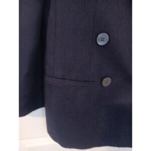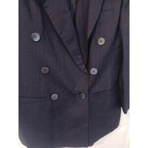 This vintage Evan Picone blazer in navy blue is a classic career piece perfect for a business occasion. Made in the USA, the 100% polyester blazer features a solid pattern with a one-button long sleeve closure and a double-breasted design with six buttons. It is lined and has shoulder pads, reflecting a timeless style with a hint of Americana. Ideal for a woman size 12 looking for a sophisticated and stylish addition to her wardrobe.