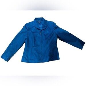 This Evan Picone blazer in a striking blue hue features a classic design with notched lapels and a smooth, slightly sheened fabric. Its fitted style and long sleeves make it an ideal choice for professional or formal occasions.
