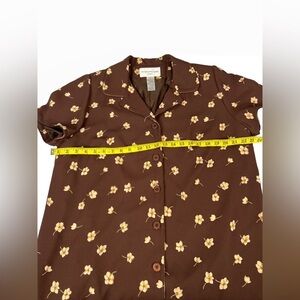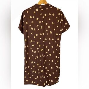 Charming brown midi dress with floral pattern. Short sleeves and button-down front. Perfect for casual outings.