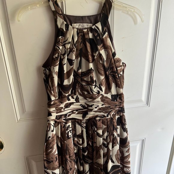 Evan Picone dress sheer fabric overlay of beige (brown), crème, black floral pattern with smocked waist. Very flattering dress to body shape and neckline. Worn once and in great condition Size 2P.