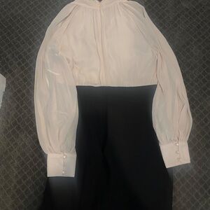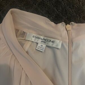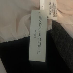 Evan Picone ladies dress. Stone/beige top color with black bottom. Top portion is lined and with long tie to hang or tie into a bow. 100% Polyester. Back zipper from neck to past waist. Form fitting. Can be worn at the office, on a dinner date or to a semi formal event. Brand new, never worn, with rags attached and all interior labels in tact.