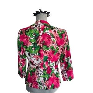 This Evan Picone blazer features a vibrant floral pattern in pink and green, perfect for adding a touch of elegance to your spring or summer wardrobe. The lightweight material and relaxed fit make it ideal for casual-dressy occasions, while the three-quarter length sleeves add a stylish touch.
