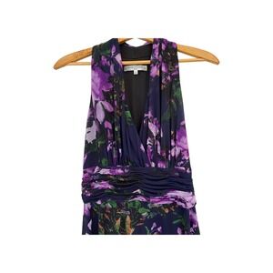 Evan Picone Floral Halter Dress Purple Midi Ruched Sleeveless Party Cocktail