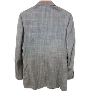Evan Picone Men's Vintage Single-Breasted Blazer in Grey. Size 40. Features notch lapel collar, long sleeves, front button closure, chest welt pocket, side flap pockets, back vent, lined, and grid plaid pattern. Excellent pre-owned condition, no flaws.