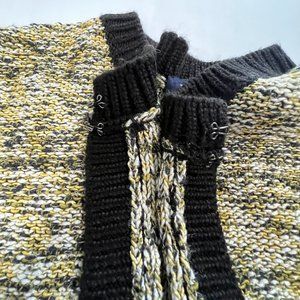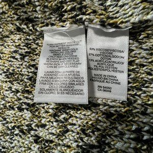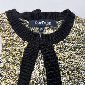 Evan Picone Petites. Open front cardigan. Top at neckline has eye and hook closure. Original extra buttons still attached. Size PXL. Yellow speckled/heather pattern with whites and black color. Black trim. Faux front pockets.