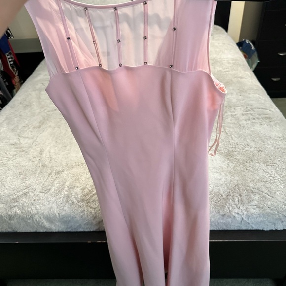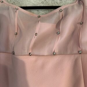Elegant pink dress with sleeveless design. Features delicate embellishments on the neckline.