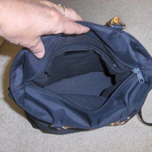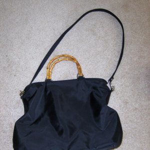 Black XL bag. Bamboo short handles only. The longer detachable shoulder strap DOES NOT COME WITH THIS! Take note of that please. Zipper closure over top to secure. Inside back zippered pocket for lipstick, etc. Nylon material for easy damp cloth clean up if needed. Pre-owned and used once. Measures: