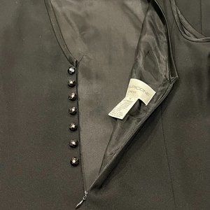 This sleeveless maxi dress features a v-neck, a hidden front zipper placket with decorative buttons, satin trim, and an A-line shape. It is fully lined. New with tags, excellent condition, black crepe, size 14