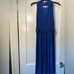 Sleeveless mid-length dress in a striking cobalt blue color. The dress features a high neckline and is designed with a gathered or ruched detail around the waist, adding texture and interest to the silhouette. The bodice drapes elegantly, providing a soft and flattering fit that flows into the long, smooth skirt. This dress is likely made from a lightweight, stretchy fabric, which would contribute to its comfortable and graceful drape. The overall design is both elegant and sophisticated, making it a suitable choice for formal events, evening occasions, or any setting where a polished and refined look is desired.
