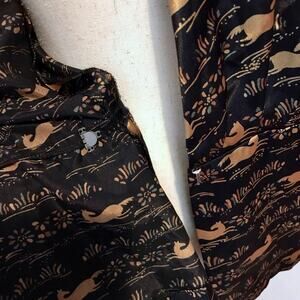 Excellent condition. Vintage Wrap Long Sleeves Blouse for Women Size 8. Black with gold, green, bronze graphic design throughout, mandarin collar, hooks on waist to close, pleated shoulders, convertible to open front cardigan if desired. Pictures are part of description.