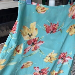 Flowy Lightweight Vibrantly Turquoise Evan Picone 100% Silk Floral Midi Skirt Size 8. Gorgeous bias cut slinky drapy skirt with pink, orange and green floral print in great condition.