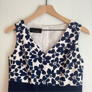 This sleeveless A-line dress by Evan Picone features a striking blue and white color scheme, perfect for wedding guests or cocktail events. The tiered design with ruffled accents and a flattering V-neckline adds a touch of elegance, while the structured fabric ensures a graceful silhouette.